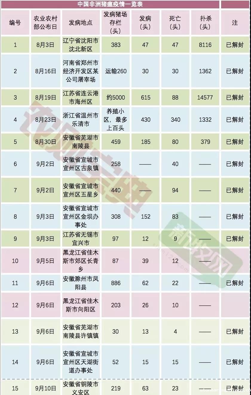 10月25日11时,农业农村部接到中国动物疫病预防控制中心报告,贵州省动物疫病预防控制中心送检样品经中国动物卫生与流行病学中心(国家外来动物疫病研究中心)确诊为非洲猪瘟。阳性样品来自贵州省毕节市赫章县一养殖户,该养殖户存栏生猪10头、发病8头、死亡8头。