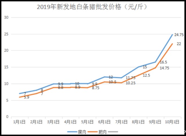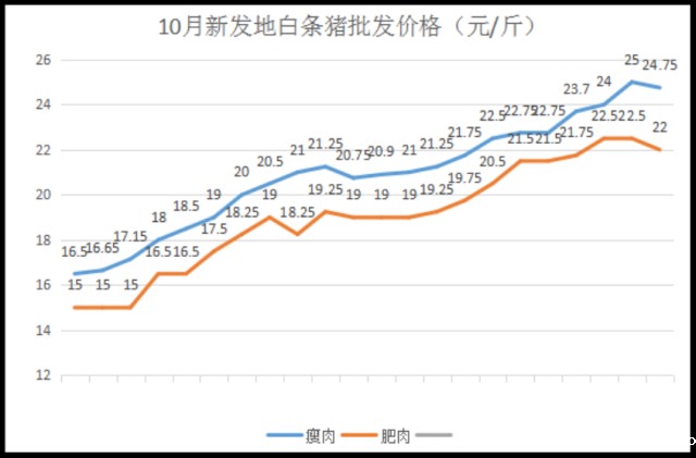 北京新发地市场数据显示,10月白条猪批发价一天一价。其中,瘦肉价格从10月1日的16.5元/斤到10月22日的24.75元/斤,上涨了8.25元;同期肥肉上涨了7元。