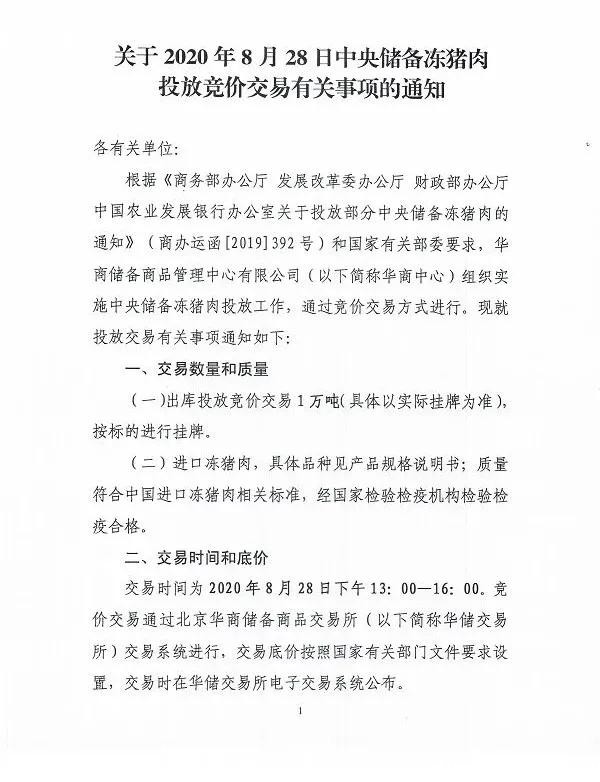 华储网25日发布公告,华商储备商品管理中心有限公司将出库投放竞价交易1万吨中央储备冻猪肉,交易时间为2020年8月28日下午13:00-16:00。