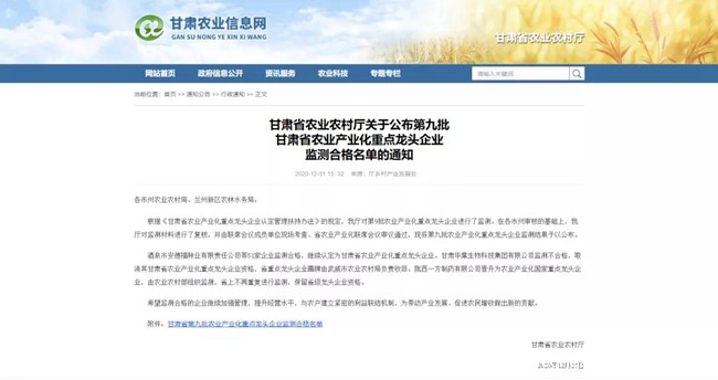 竞技宝JJB官方入口讯 日前,甘肃省农业农村厅发布了《关于第九批甘肃省农业产业化重点龙头企业监测合格名单的通知》,甘肃竞技宝JJB官方入口顺利通过监测,继续保持甘肃省农业产业化重点龙头企业资格。