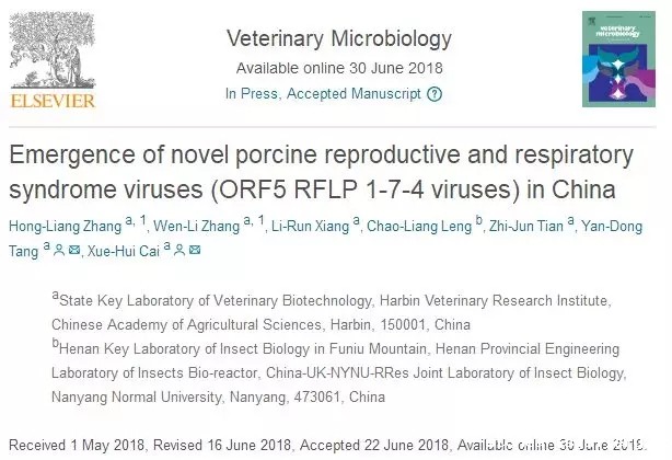 2018年6月30日,国际知名期刊Veterinary Microbiology(兽医微生物)在线发表中国农业科学院哈尔滨兽医研究所动物病原监测与流行病学团队的最新研究,该团队在我国首次发现分支为ORF5 RFLP 1-7-4分支PRRSV的毒株。
