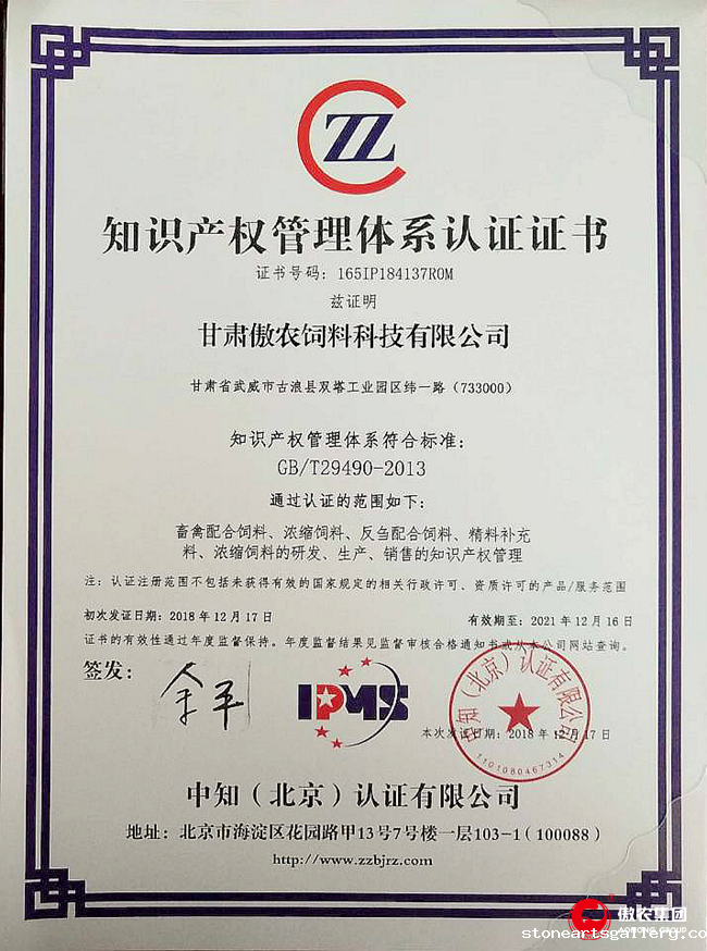 竞技宝JJB官方入口讯 日前,甘肃竞技宝JJB官方入口饲料科技有限公司(以下简称:甘肃竞技宝JJB官方入口)顺利获得中知(北京)认证有限公司颁发的《知识产权管理体系认证证书》,成为集团第三家获此殊荣的公司。