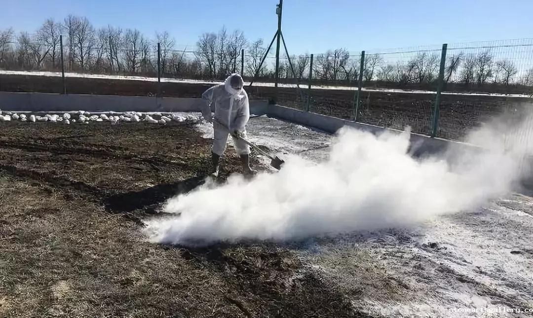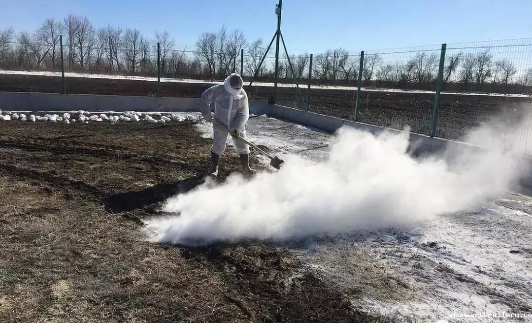 处理粪便泻湖:用25%干漂白剂粉末消毒剂覆盖猪场所述范围。图:Gustavo Lopez