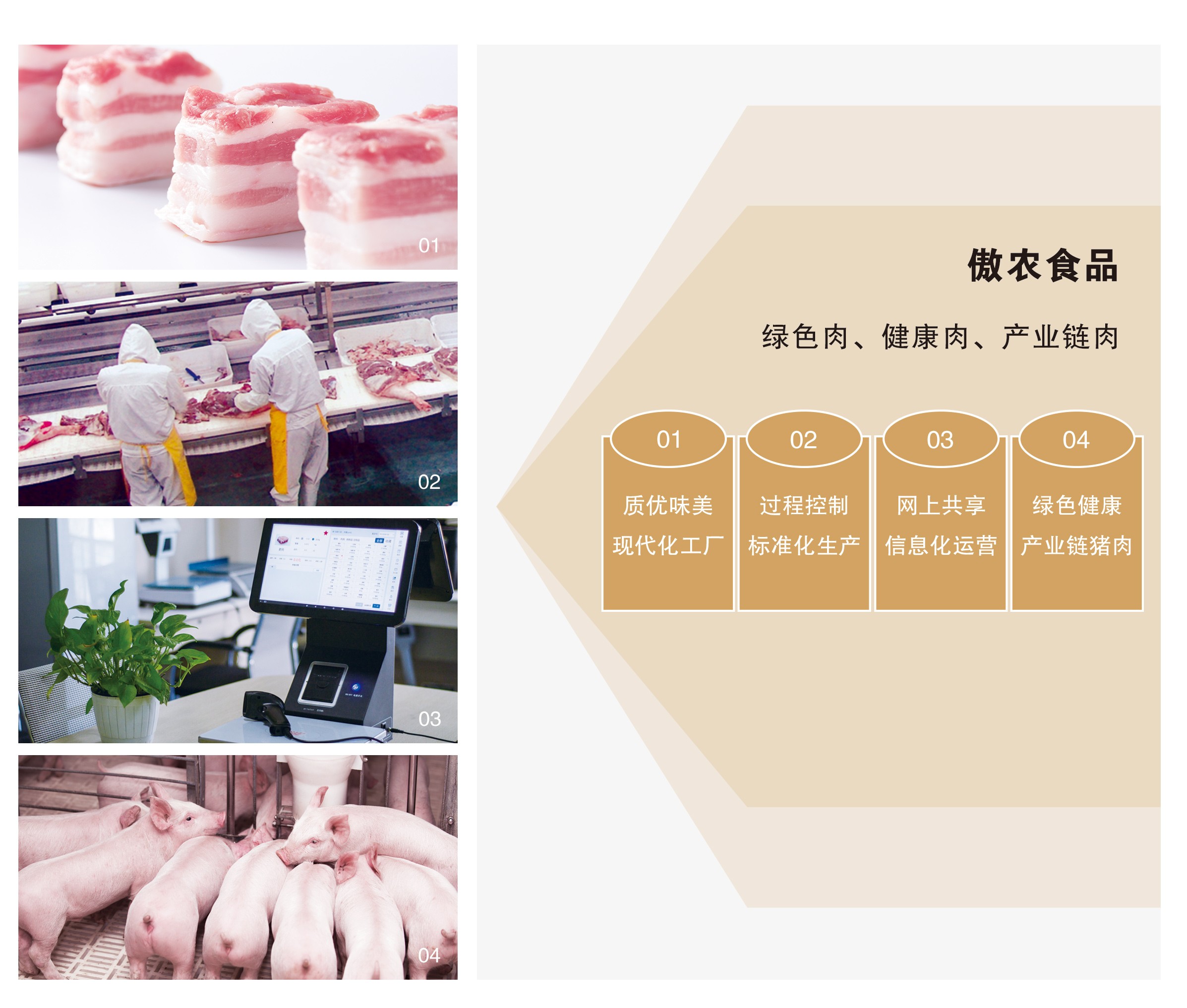 04 绿色健康 竞技宝JJB官方入口食品从饲料原料采购、饲料生产、生猪养殖、屠宰加工、物流配送到终端销售形成一个完善的产业链条,全程严格控制,开创竞技宝JJB官方入口“绿色健康”猪肉品牌。